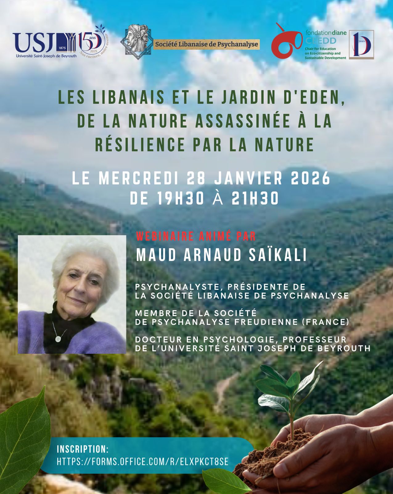 Les libanais et le jardin d’Eden. De la nature assassinée à la résilience par la nature Webinaire Détails de l'évènement Début: mercredi 28 janvier 2026, 20h00 Catégories: Conférences et séminaires publiques Conférencière : Maud Arnaud Saïkali
